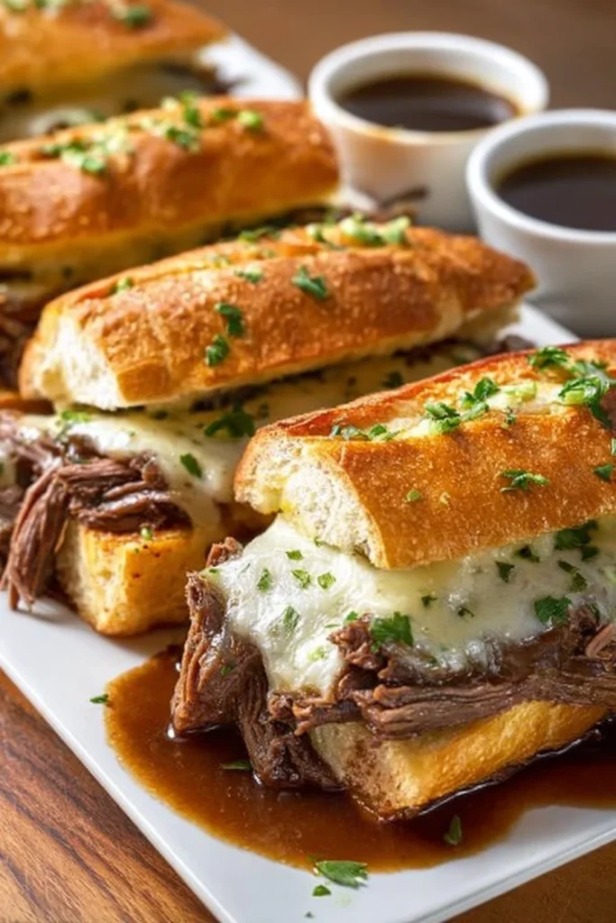 - Serve on French rolls, topped with cheese and au jus for dipping.