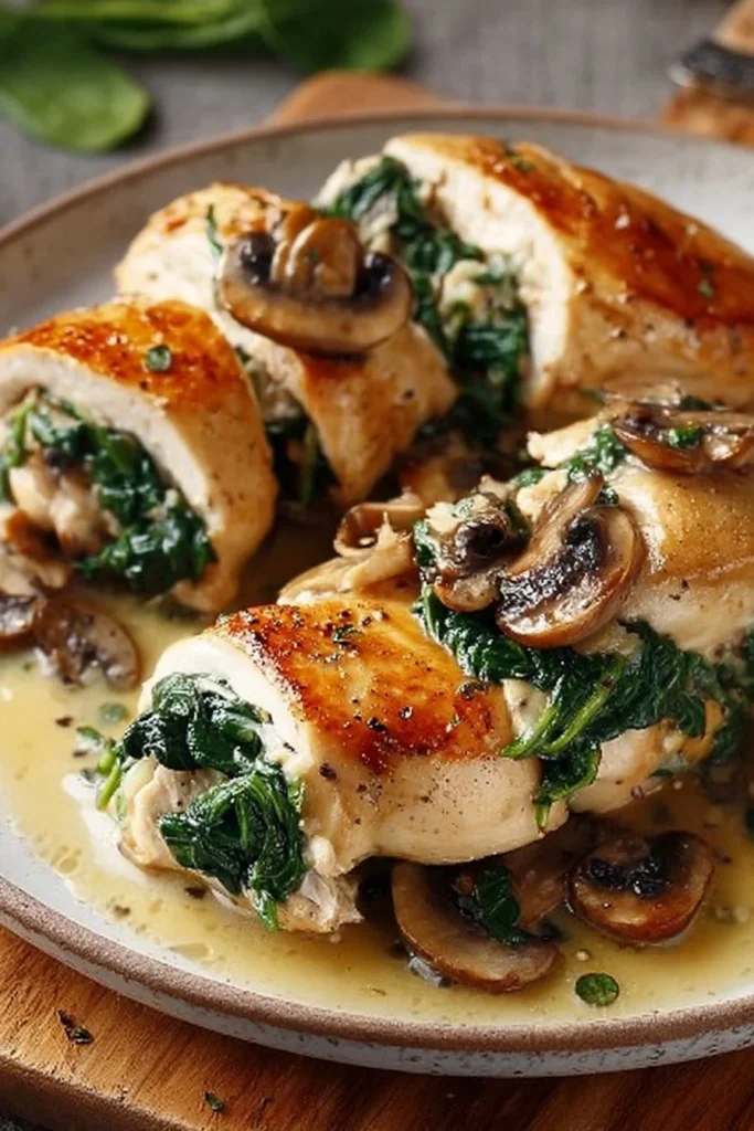 A delicious and healthy dish that combines juicy chicken with savory mushrooms and fresh spinach, all wrapped up with creamy cheese, making it perfect for family dinners or cozy meals with friends.
