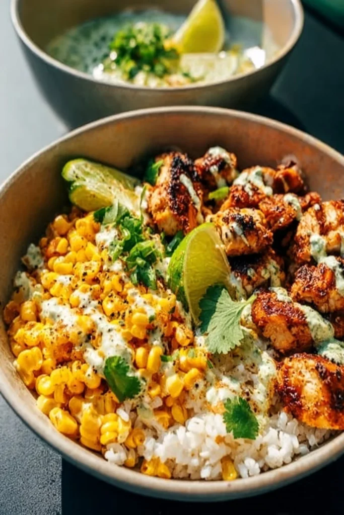 Serve the Street Corn Chicken Rice Bowl warm. Place all the ingredients in a bowl and drizzle with the lime crema. You can also serve it with additional lime wedges or a side of tortilla chips for a crunchy touch. This bowl is not only delicious to eat, but it also looks great on the table!